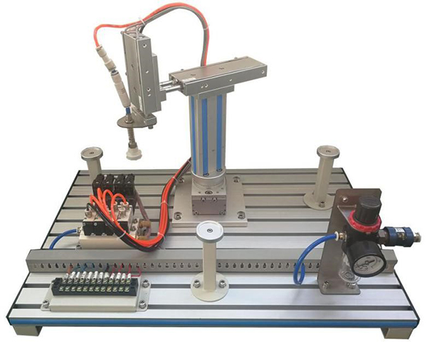 模型由回轉(zhuǎn)氣缸、雙軸氣缸、單軸氣缸、吸盤、真空發(fā)生器、電磁閥、節(jié)流閥、手滑閥、減壓閥、磁性開關(guān)、機(jī)械部件、工業(yè)鋁合金型材底板等組成,設(shè)有兩個(gè)抓取工位,可進(jìn)行工件取放控制練習(xí)?砷_展對(duì)氣動(dòng)機(jī)械手的操作及編程控制訓(xùn)練。配有空氣壓縮機(jī):靜音無油,工作電源AC220V±10% 50Hz,輸入功率0.68kW;公稱容積24L,理論流量:116L/min,額定輸出氣壓0.7MPa。