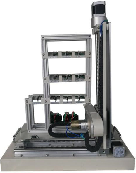 模型包含三層九倉位庫體、出/入庫倉位庫體、三維(X、Y、Z)運(yùn)動(dòng)機(jī)械及電氣控制等部分組成;定位執(zhí)行機(jī)構(gòu)由豎軸和橫軸組成;驅(qū)動(dòng)機(jī)構(gòu)由步進(jìn)電機(jī)及步進(jìn)電機(jī)驅(qū)動(dòng)器組成;傳動(dòng)軸為滾珠絲桿傳動(dòng)和雙軸導(dǎo)軌帶傳動(dòng),傳動(dòng)平穩(wěn)。取物軸由直流減速電機(jī)驅(qū)動(dòng),可實(shí)現(xiàn)前后兩方向的運(yùn)動(dòng)。 |