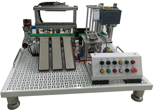 (4)按鈕模塊采用型材底座,安裝面板與桌面成45°夾角,包含急停按鈕1只,旋鈕開關(guān)3只,自鎖帶燈按鈕黃、綠、紅各1只,所有按鈕和旋鈕觸點(diǎn)均引至端子接線排上;自動(dòng)上料模塊主體安裝在工業(yè)型材上,結(jié)構(gòu)由鋁型材構(gòu)成,方型工件庫1件,物料推出機(jī)構(gòu)1件,光電傳感器,單缸氣缸1只,主要完成將工件庫中的工件依次推出;傳輸線模塊主要包含直流電機(jī)1臺(tái),滾動(dòng)軸承4只,滾輪2只,傳輸帶1條,主要完成將工件輸送到分揀區(qū);物料檢測及分揀模塊主要包含氣缸3個(gè),電感傳感器1只,電容傳感器1只;漫反射式光電傳感器1只,物料分揀槽3個(gè),完成物料的分揀工作。調(diào)壓閥主要安裝在型材底座支架上,含有手滑閥可控制氣路的通斷和壓力。輔助器件包含接線端子、物料、實(shí)訓(xùn)導(dǎo)線、氣管等,模型控制所需的I/O點(diǎn)數(shù)與所配主機(jī)I/O點(diǎn)數(shù)相配套。氣缸使用范圍0.1-1MPa,工作溫度-15-60℃,活塞帶磁環(huán)可完成檢測;光電傳感器檢測范圍不小于1CM,輸出電流80-200MA,防護(hù)等級(jí)IP65,輸出方式NPN常開;傳感器檢測范圍不小于1CM,輸出電流80-200MA,防護(hù)等級(jí)IP65,輸出方式NPN常開。