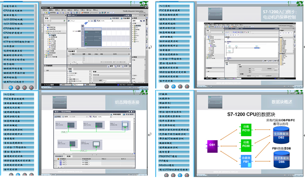 配有S7-1200 PLC學(xué)習(xí)軟件,方便老師教學(xué),提供有功能與特點(diǎn)、模塊安裝、選型、工作原理、支持的數(shù)據(jù)類型、數(shù)據(jù)的存取方式、程序結(jié)構(gòu)、編程軟件的安裝、編程軟件界面介紹、硬件的組態(tài)、入門實(shí)例、PLC變量表的使用、使用交叉引用、組織塊使用示例、基本位邏輯指令、上升沿-下降沿指令、置位-復(fù)位指令、接通延時(shí)定時(shí)器、比較指令、移位-循環(huán)移位指令、基本邏輯運(yùn)算指令、數(shù)據(jù)塊概述等50多個(gè)學(xué)習(xí)項(xiàng)目。PLC學(xué)習(xí)軟件參考界面如下: