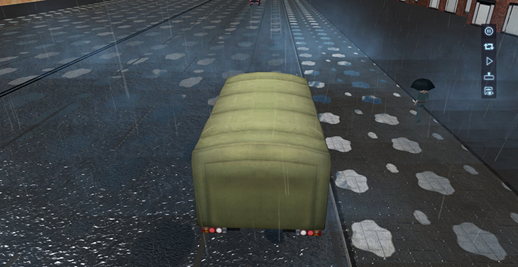 1.1.2 使用汽車動力學(xué)仿真數(shù)學(xué)模型,根據(jù)模擬駕駛車輛的質(zhì)量、速度、懸掛性能、摩擦系數(shù)等自身屬性參數(shù)和硬件方向盤的輸入值,以及平原、山地、沙漠等典型地形路面特征信息,結(jié)合硬件解析模塊得到的相關(guān)操作指令(啟動、轉(zhuǎn)向、倒車、換檔),實現(xiàn)模擬車輛駕駛前進、倒退、轉(zhuǎn)彎、速度變化、姿態(tài)變化等多種駕駛物理效果;根據(jù)油門、剎車輸入的值結(jié)合當(dāng)前檔位確定縱向加速度,實現(xiàn)模擬車輛加速、剎車等運行效果;根據(jù)車身懸掛系統(tǒng)、運行速度結(jié)合地形,實現(xiàn)模擬車輛運行中的顛簸效果和車輛姿態(tài)信息。