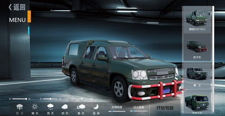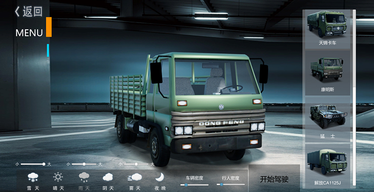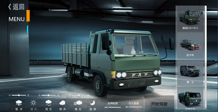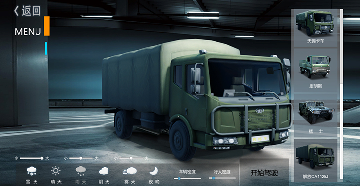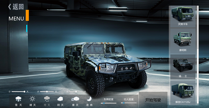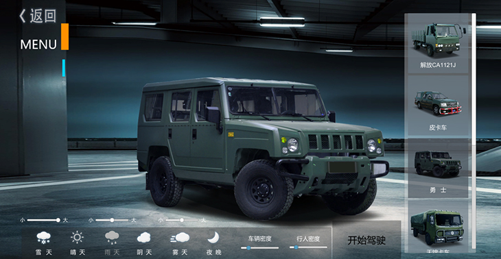 7.1、仿真車模型:10 種典型虛擬車輛模型:東風(fēng)猛士、北汽勇士、 EQ1118、EQ1121 EQ2102、SX2150、SX2190、豪濼 ZZ2197、東風(fēng)天錦、大客車等,并可根據(jù)需要拓展、定制個 性化車輛模型。