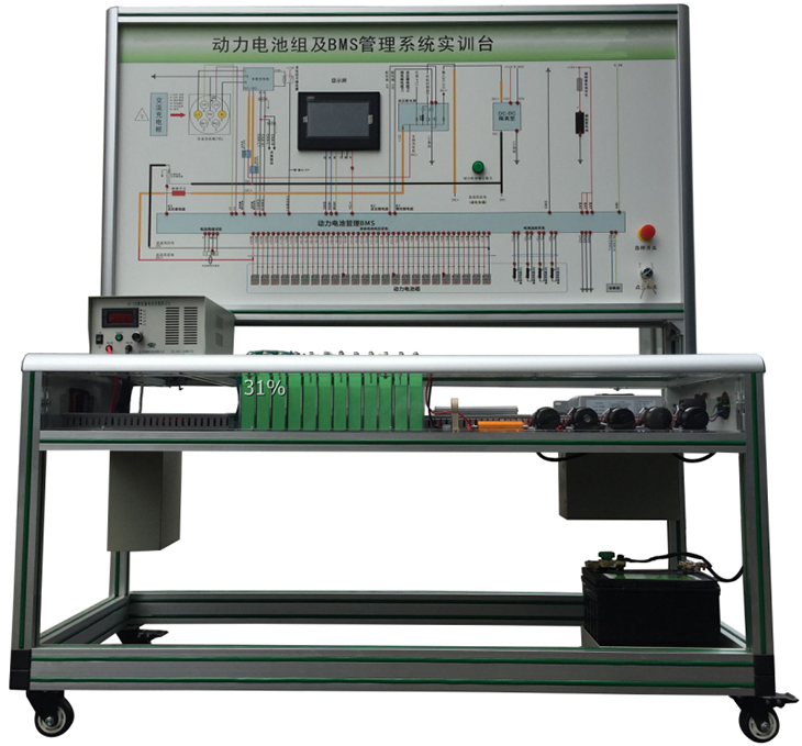 動力電池管理系統(tǒng)實訓臺選用新能源車輛磷酸鐵鋰 動力電池包,單體電池(3.2V20AH,共24串),帶CAN總線的一體機BMS電池管理系統(tǒng),有被動均衡功能;真實地呈現(xiàn)了磷酸鐵鋰動力電池包核心零部件之間的連接控制關(guān)系、安裝位置和運行參數(shù),以及高壓系統(tǒng)安全注意事項,并培養(yǎng)學員對磷酸鐵鋰動力電池包(BMS)故障分析和處理能力。適用于了解與驗證電動汽車的動力電池參數(shù)進行實時監(jiān)控、故障診斷、SOC估算、短路保護、絕緣檢測、充放電控制、均衡等功能,并通過CAN總線的方式與帶CAN通訊的車載充電機進行信息交互,保障電動汽車高效、可靠、安全運行的BMS教學實訓實驗。