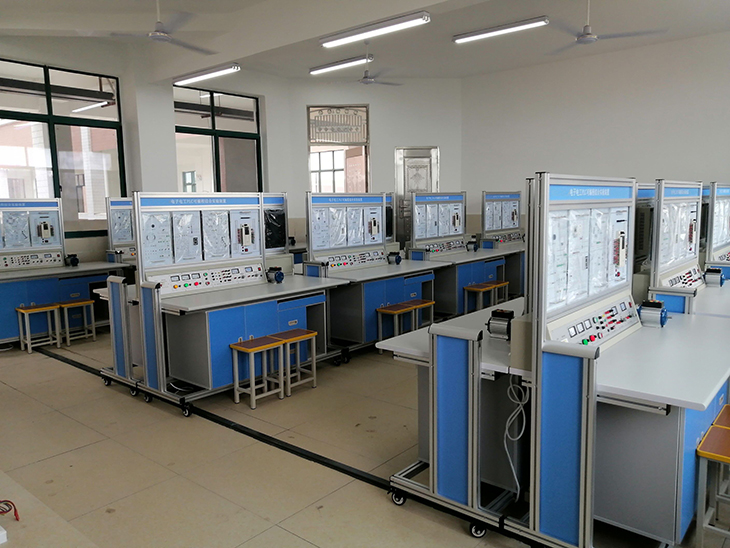 電子電工與PLC實訓(xùn)室配置有西門子公司S7-1200系列PLC作為控制核心,同時配套有流水燈、港口起重機、十字路交通燈、三層電梯、天塔之光等預(yù)設(shè)實訓(xùn)模塊。其附帶有7英寸彩色觸摸屏,通信下載編程電纜,觸摸屏與PLC通信電纜,開發(fā)組態(tài)軟件等配套設(shè)備,構(gòu)建了完全真實的PLC項目開發(fā)環(huán)境,便于學(xué)生演練PLC項目開發(fā)的全套流程。同時,實訓(xùn)設(shè)備外掛了電子實訓(xùn)模塊,可供學(xué)生進行電子相關(guān)實訓(xùn)。該實訓(xùn)室利用多媒體教學(xué)、網(wǎng)絡(luò)教學(xué)等先進手段,將復(fù)雜知識點簡單化,將實訓(xùn)內(nèi)容與工作任務(wù)融合為一,實現(xiàn)了一體化教學(xué)的目的。